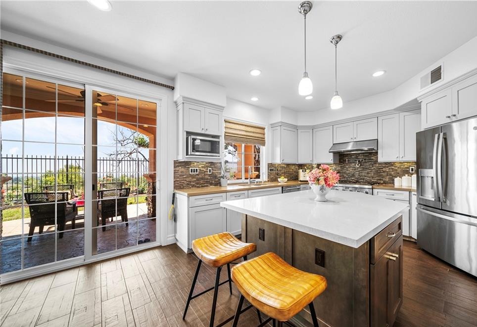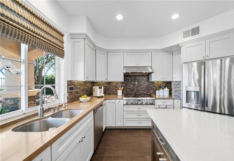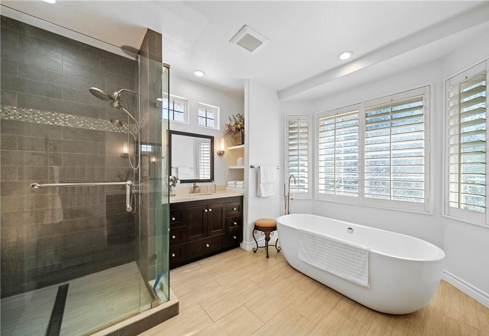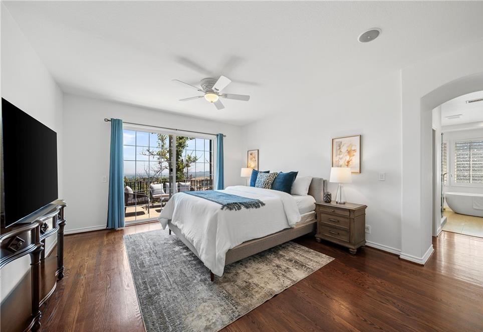 View! View! View! Welcome to this stunning Mediterranean-style home tucked inside Altadena’s exclusive guard-gated La Vina community. This spacious two-story residence offers 5 bedrooms and 4.5 bathrooms across approximately 3,348 square feet of elegant living space, designed for both comfortable family living and upscale entertaining. The grand entryway greets you with soaring ceilings and a sweeping staircase, leading into refined formal living and dining rooms. The open-concept kitchen flows effortlessly into a warm family room with a fireplace, and features a center island, a wine cellar, and direct access to a serene patio with panoramic canyon, city, and mountain views. Ideal for multi-generational living, the home includes a first-floor En-suite bedroom, while upstairs boasts four additional bedrooms—including a luxurious primary suite, spa-like bathroom, walk-in closet, and a private balcony with stunning vistas. Additional highlights include hardwood flooring, new interior paint, new water heater, new landscaping, HVAC (2016), high-end bidet toilets, whole-house water filtration system (2019), security system, laundry room, and an attached two-car garage. The La Vina community offers resort-style amenities such as a sparkling pool, playground, and hiking trails surrounded by nature – all just minutes from Old Town Pasadena, Rose Bowl, and major freeways. Experience peaceful hillside living with the convenience of city access – this home truly has it all.